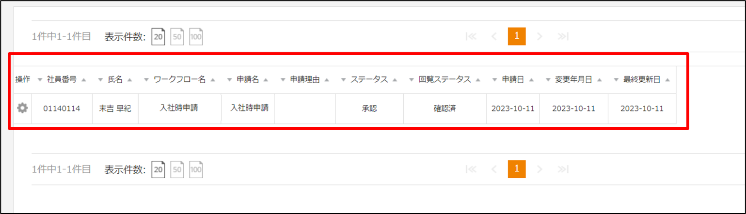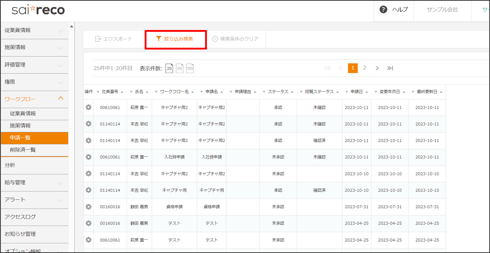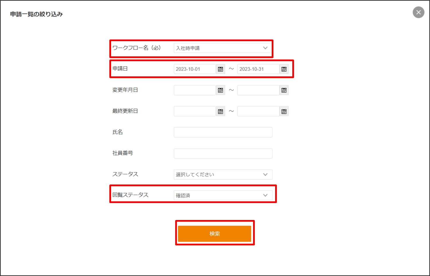 一定期間内に回覧されたワークフローを一覧で見ることはできますか? 2023年10月17日 02:11 更新 ワークフロー > 申請一覧より可能です。 ※絞り込み検索は、管理者画面でのみ可能です。 絞り込み検索の操作は以下をご参照ください。 例)一定期間内で回覧されたワークフローを一覧で確認したい。 ワークフロー > 申請一覧 から操作します。 1.[絞り込み検索]をクリックします。 2.[ワークフロー名]を選択し、[申請日※]を選択し、[回覧ステータス]を「確認済」にしてから、[検索]をクリックします。 ※「申請日」は従業員が申請を上げた日付です。 2023/10/1~2023/10/31の間に「入社時申請」ワークフローが回覧された一覧が表示されます。