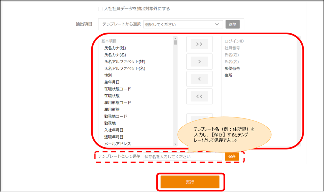 「変更情報抽出」では何ができますか? 2024年04月23日 11:13 更新 「変更情報抽出」では以下が可能です。 指定した期間内(最長1ヶ月)で「従業員情報」が変更された情報のみを抽出する。※但し履歴削除(画面・インポートとも)は除く 例えば、2022/12/1~2022/12/31までに、住所が変更された従業員や入社した従業員の情報を抽出できます。 操作方法は以下の通りです。 例)2022/12/1~2022/12/31で郵便番号と住所が登録された従業員のみを抽出したい 従業員情報 > 変更情報抽出 から操作します。 1.[抽出期間](今回は2022/12/1~2022/12/31)[抽出方法](今回は「特定の期間の追加・更新・削除履歴データを抽出)[抽出条件](今回は基準日)を入力します。 ※[抽出方法]が以下2種ございます。 ・「特定の期間の追加・更新・削除履歴データを抽出」:指定した期間内に追加・更新・削除が行われた履歴データを全て抽出 ・「2つの基準日の差分データ」:設定した基準日期間内に追加・更新・削除が行われた履歴データの最新の履歴のみを抽出 ※[抽出条件]の詳細は以下記事をご参照ください。変更情報抽出の「更新日」・「基準日」・「更新日または基準日」の違いは何ですか? 2.[抽出項目](今回は郵便番号と住所)を選択し、[実行]をクリックします。 3.Excelファイルがダウンロードされますので、開くと変更情報が確認できます。 関連記事 2022年12月22日更新 【変更情報抽出】「2つの基準日の差分データ」の機能が追加されます 【従業員用】初回ログインはどのようにしたらよいですか?(スマートフォン) 「計算式(日付)」・「計算式(数値)」パーツはどのような場面で使用をしますか? 【従業員用】初回ログインはどのようにしたらいいですか?(PC) 従業員が部署異動した際はどのような設定をすればよいですか?