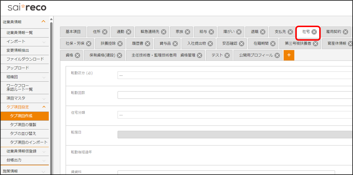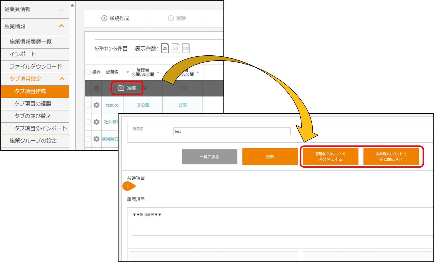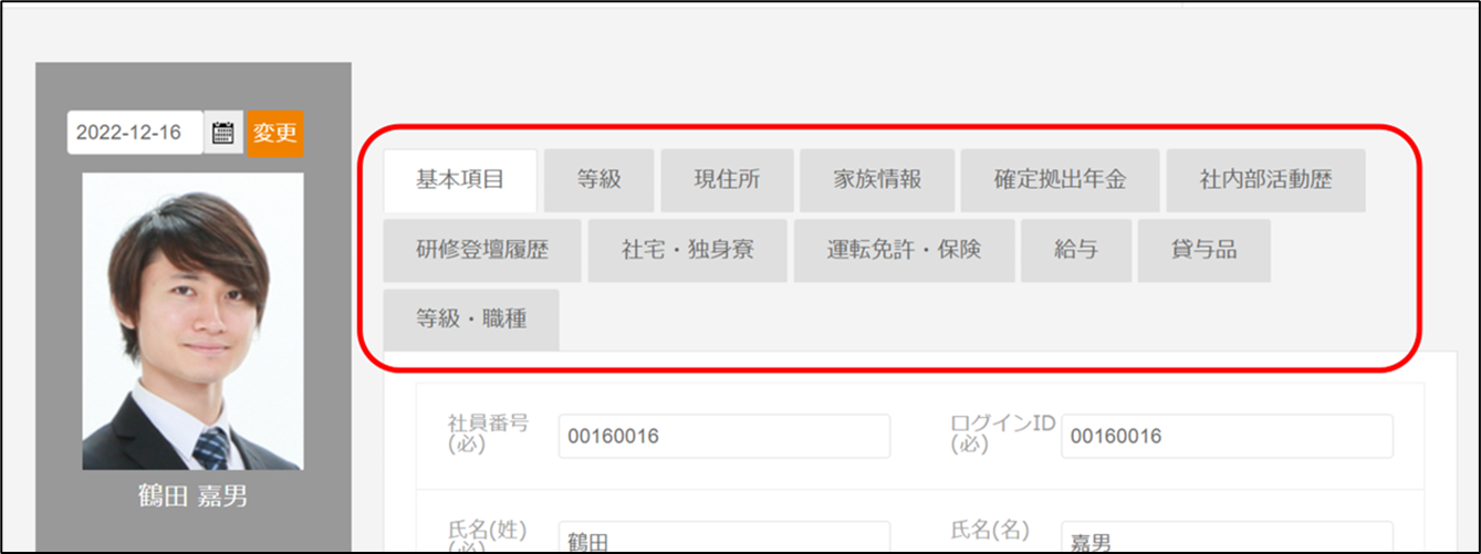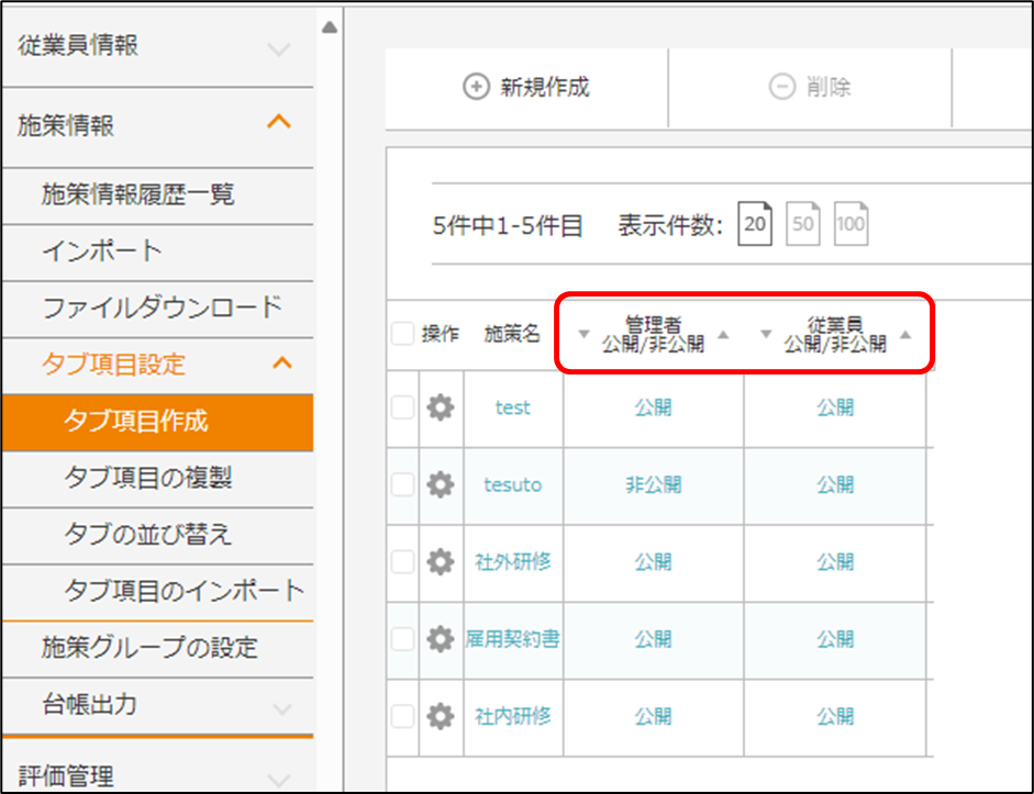 従業員情報・施策情報のタブは非表示にできますか? 2024年05月28日 03:03 更新 可能でございます。 ※従業員情報の「基本項目」は、非表示にはできかねます。 項目の表示・非表示は以下記事をご参照ください。「権限」とは何ですか? 設定方法を以下記載いたします。 目次 従業員情報のタブを非表示にする 施策情報のタブを非表示にする 従業員情報のタブを非表示にする 従業員情報 > タブ項目設定 > タブ項目作成 から操作します。 1.非表示にしたいタブを選択します。 2.画面下部にある「管理者アカウントで非公開にする」「従業員アカウントで非公開にする」をクリックします。※設定は管理者アカウント、従業員アカウントの全員に反映されます。・管理者アカウントで公開/非公開する…管理者アカウントでログインし、従業員の詳細画面を確認した際に公開/非表示になります。・従業員アカウントで公開/非公開にする…従業員アカウントでログインし、本人情報 or 部下情報を確認した際に公開/非公開になります。 3.管理者アカウントで従業員の詳細画面を確認した際/従業員アカウントで本人情報や部下情報の詳細画面を確認した際には、タブが非表示になります。 施策情報のタブを非表示にする ・「タブ項目作成」の一覧で設定する・「タブ項目作成」の詳細で設定する 「タブ項目作成」の一覧で設定する 施策情報 > タブ項目設定 > タブ項目作成 から操作します。 1.「管理者公開」「従業員公開」をクリックします。※設定は管理者アカウントの全員に反映されます。・管理者公開/非公開…管理者アカウントでログインし、従業員の詳細画面を確認した際に公開/非表示になります。・従業員公開/非公開…従業員アカウントでログインし、本人情報 or 部下情報を確認した際に公開/非公開になります。 2.管理者アカウントで従業員の詳細画面を確認した際/従業員アカウントで本人情報や部下情報の詳細画面を確認した際には、タブが非表示になります。 「タブ項目作成」の詳細で設定する 施策情報 > タブ項目設定 > タブ項目作成 から操作します。 1.非公開にしたい施策の[]にカーソル合わせ、[編集]をクリックします。 「管理者アカウントで非公開にする」「従業員アカウントで非公開にする」をクリックします。※設定は管理者アカウント、従業員アカウントの全員に反映されます。・管理者公開/非公開…管理者アカウントでログインし、従業員の詳細画面を確認した際に公開/非表示になります。・従業員公開/非公開…従業員アカウントでログインし、本人情報 or 部下情報を確認した際に公開/非公開になります。 2. .管理者アカウントで従業員の詳細画面を確認した際/従業員アカウントで本人情報や部下情報の詳細画面を確認した際には、タブが非表示になります。 関連記事 「権限」とは何ですか? 計算式(日付)の「フォーマット」とは何ですか? 基本機能/管理者マニュアル 従業員情報のタブ項目を複製することはできますか? 総務人事奉行クラウド連携/マニュアル