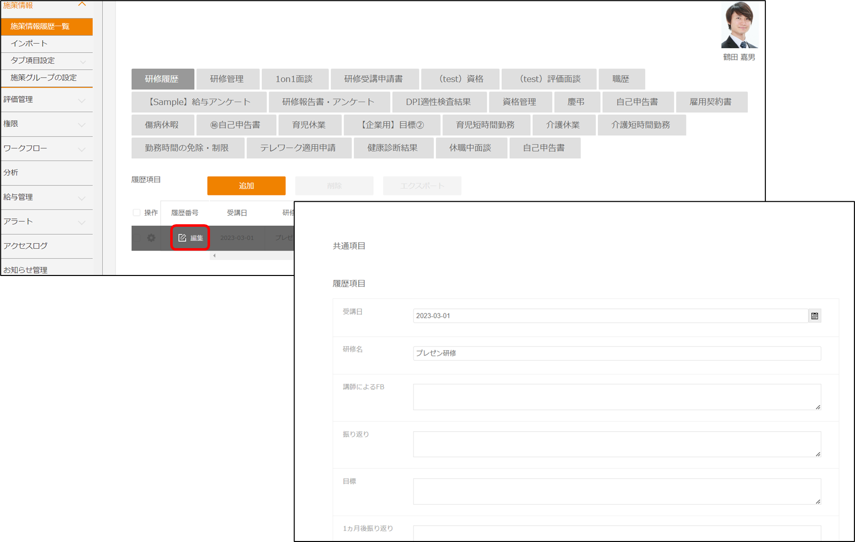 【従業員用】従業員画面では何ができますか?(PC) 2023年11月06日 09:33 更新 以下が可能です。 社内のお知らせを確認する ワークフローで申請を上げる ワークフローを承認する 給与・賞与明細や源泉徴収票を確認する アラートを設定する 本人情報を確認する 部下情報を確認する タイムラインを確認する ※運用によっては、使用しない機能もございます。 ※管理者の設定により、非表示になっているメニューもございます。 ※評価管理の操作方法は以下記事をご参照ください。・被評価者用【従業員用】目標設定や自己評価はどのように入力したらよいですか?・評価者用【従業員用】目標承認、一次~四次評価はどのように入力したらよいですか?操作方法は以下の通りです。 社内のお知らせを確認する お知らせ > 社内のお知らせ から操作します。 閲覧したいお知らせをクリックし、内容を確認します。 「HOME」からでも確認が可能です。 ワークフローで申請を上げる ワークフロー > 申請 から操作します。 1.[新規作成]をクリックします。「ワークフロー名」「変更年月日」「申請内容」を入力し、[申請]をクリックします。「申請してよろしいですか?」というメッセージが表示されたら、[Yes]をクリックします。 ※申請内容には、変更年月日時点の最新の情報が表示されています。※変更年月日の入力欄が表示されないワークフローもございます。 2.「登録が完了しました」と表示されたら、申請完了です。 【参考】申請をキャンセルしたい場合は、以下記事をご参照ください。 【従業員用】ワークフローの申請キャンセルはできますか? ワークフローを承認する HOME画面の[本人の未承認件数]から承認する。 ワークフロー > 承認から承認する。 HOME画面の[本人の未承認件数]から承認する。 HOME画面から[本人の未承認件数]をクリックすると本人の承認画面に飛べます。 1.[本人の未承認件数]をクリックすると、ステータスが[未承認]、次承認者が[本人]の画面に飛ぶことができます。 2.承認したいワークフローの[]にカーソルを合わせ、詳細をクリックします。内容を確認し、承認 or 却下を選択します。却下の場合は却下理由を記載します。選択完了後、[登録]をクリックします。 3.「承認(却下)してよろしいですか?」というメッセージが表示されたら、[Yes]をクリックします。「承認(却下)が完了しました」というメッセージが表示されたら完了です。 HOME画面から[本人以外の未承認件数]をクリックすると本人以外の承認画面に飛べます。 [本人以外の未承認件数]をクリックすると、ステータスが[未承認]、次承認者が[本人以外]の画面に飛ぶことができます。 ワークフロー > 承認から承認する ワークフロー > 承認 にて操作します。 1.承認したいワークフローの[]にカーソルを合わせ、詳細をクリックします。内容を確認し、承認 or 却下を選択します。却下の場合は却下理由を記載します。選択完了後、[登録]をクリックします。 2.「承認(却下)してよろしいですか?」というメッセージが表示されたら、[Yes]をクリックします。「承認(却下)が完了しました」というメッセージが表示されたら完了です。 給与・賞与明細/源泉徴収票を確認する 給与明細 から操作します。 閲覧したい給与・賞与明細/源泉徴収票を選択すると、表示されます。 アラートを設定する アラート > アラート一覧 から操作します。 1.[新規作成]をクリックし、アラートの内容を設定します。内容の入力が完了したら、[登録]をクリックします。 2.アラート一覧に追加されたら完了です。 本人情報を確認する 本人情報 から操作します。 登録情報 or 施策情報をクリックし、内容を確認します。※閲覧権限が付与されていない項目は閲覧できません。 【参考】「編集」権限が付与された項目は入力が可能です。入力完了後[タブを保存]をクリックしてください。 部下情報を確認する ※「部下情報」は「上長」権限が付与された従業員のみ表示されます。 ・従業員情報の場合・施策情報の場合 従業員情報の場合 部下情報 > 従業員情報 から操作します。 閲覧したい従業員の[]にカーソルを合わせ、[編集]をクリックし、内容を確認します。 【参考】エクスポートする場合 1.エクスポートしたい従業員にチェックし、[エクスポート]をクリックします。 2.エクスポートしたい項目とエクスポートする履歴を選択し、[実行]をクリックします。 ※エクスポートできるのは、「閲覧」または「編集」権限が付与されている項目です。 3.CSVファイルがダウンロードされますので開いて内容を確認します。 ※画像はGoogle chromeの場合です。使用するブラウザによってダウンロードしたファイルの表示は変わります。 施策情報の場合 部下情報 > 施策情報 から操作します。 1.閲覧したい従業員の[氏名]をクリックします。 確認したいタブを選択し、[]にカーソルを合わせ[編集]から内容を確認します。 【参考】エクスポートする場合 1.エクスポートしたい従業員にチェックし、[エクスポ