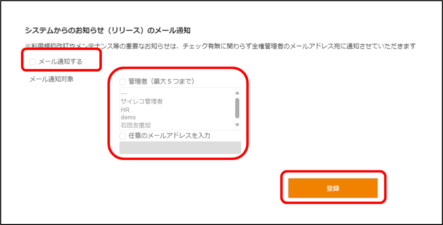 システムからのお知らせはメールで通知されますか? 2023年11月06日 09:10 更新 設定することにより通知されます。 ※システムからのお知らせのメールの通知設定は全権管理者のみが行える操作となっております。 操作を以下に記載いたします。 1.HOME画面の契約内容をクリックします 2.「システムからのお知らせ(リリース)のメール通知」の[編集]をクリックします 3.「メール通知する」にチェックを入れ、メール通知対象を選択し、[登録]をクリックします 「システムからのお知らせの通知を更新しました」というメッセージが表示されたら完了です 関連記事 【従業員用】ワークフローが申請されたら承認者に通知されますか? 請求書送付先メールアドレスの追加・変更はできますか? お知らせが公開されたらメール通知されますか? 従業員がパスワードを忘れてしまいパスワードがロックされました。どうしたらよいですか? アラート設定後に通知対象者が退職した場合、どうなりますか?