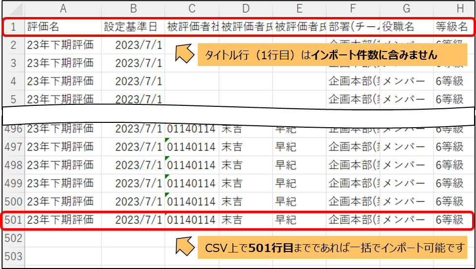 評価者の設定でCSVファイルをインポートする際に上限件数はありますか? 2023年12月11日 00:20 更新 評価者の設定にてCSVファイルをインポートする際の上限件数は、「500件/回」でございます。 関連記事 分析はどの時点の情報を元に集計されますか?
